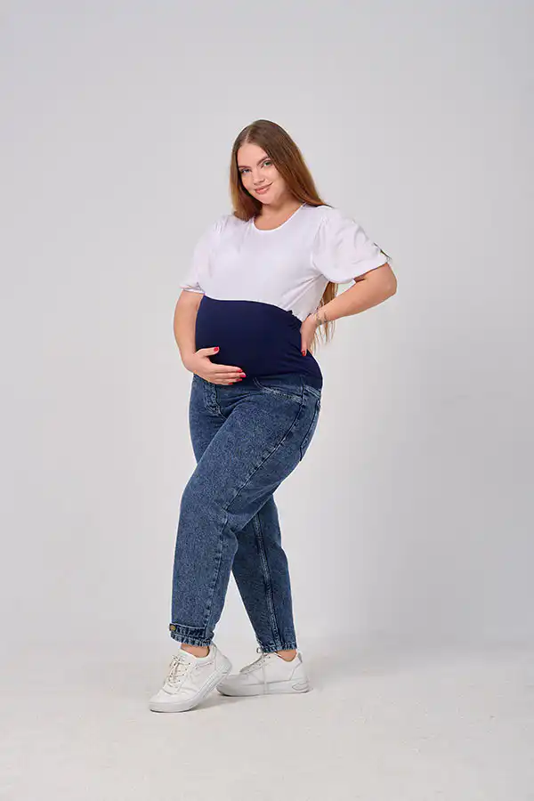بنطلون حمل بوي فريند جينز غامق مصنوع من خامة جينز نيو فيجن، تصميمه عملي ومريح يناسب الاستخدام من أول شهور الحمل لحد آخره، وكمان ينفع بعد الولادة.
