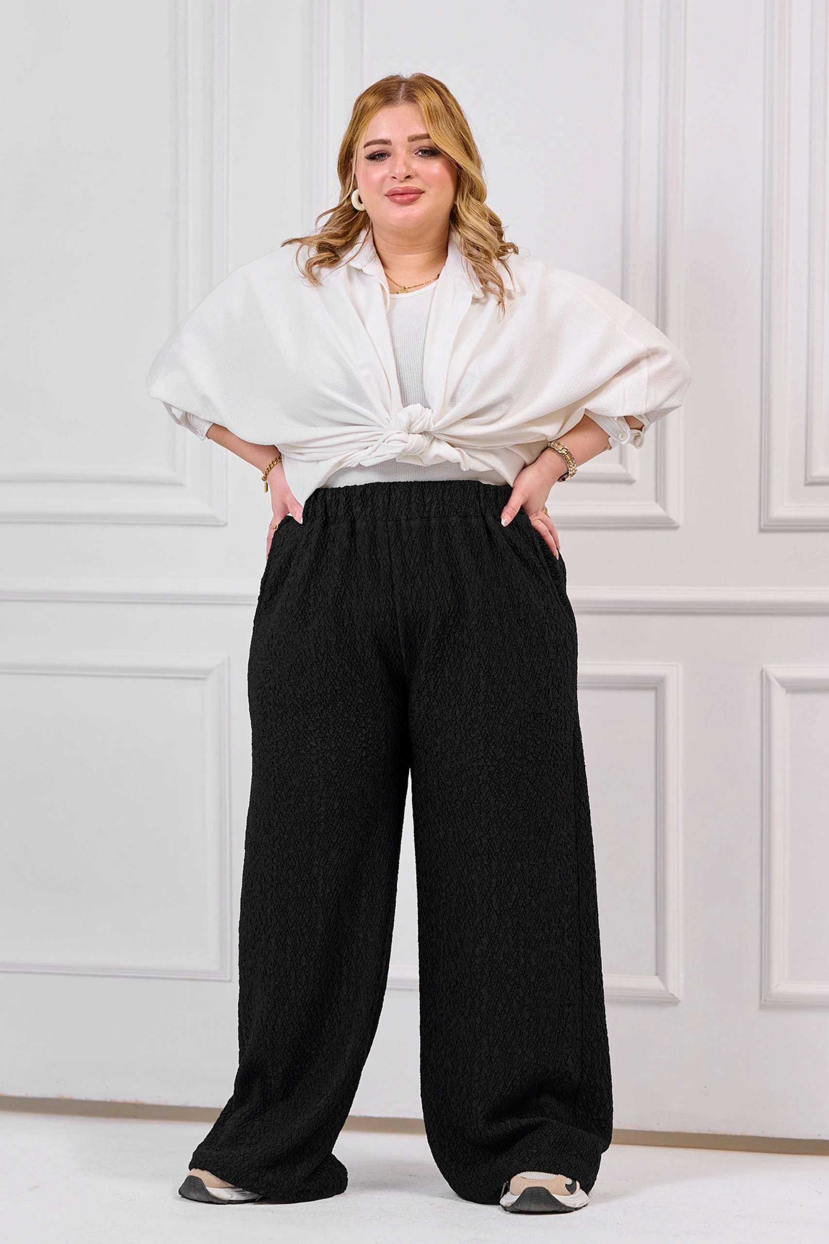 بنطلون واسع أسود بقصة مريحة وخامة مميزة بملمس Textured تضيف لمسة عصرية لاطلالتك .